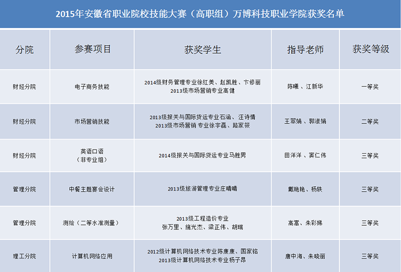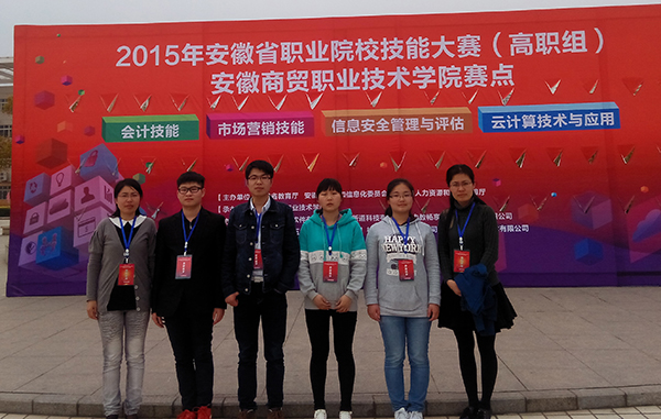 日前,2015年安徽省职业院校技能大赛(高职组)比赛结果正式公布,我院在此次大赛中获得重大突破,由我院财务管理专业和市场营销专业4名同学组成的电子商务参赛团队在电子商务技能项目上勇夺一等奖,其次我院在财经大类、电子信息大类、旅游大类等比赛项目中也收获颇丰,获得二等奖1项,三等奖4项的好成绩。