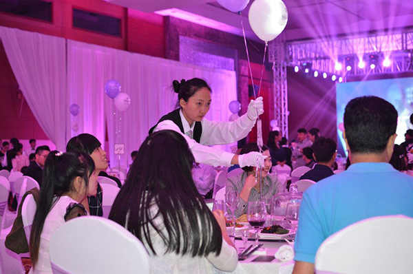 酒店工作人员首先根据此次活动对我院学生进行了细心的讲解和培训,还手把手的教他们如何更加规范的操作。酒店二楼大宴会厅的鸡尾酒现场,菲律宾乐队的现场演绎“美女与野兽”,还有12位安徽省内书画名家在现场展示如行云流水般的挥毫泼墨。18时18分的外场庆典,酒店总经理诚邀领导与贵宾一同放飞888只充满着希望的气球,祝愿合肥元一希尔顿酒店的未来如这满载着希望的气球一般“一飞冲天”。
