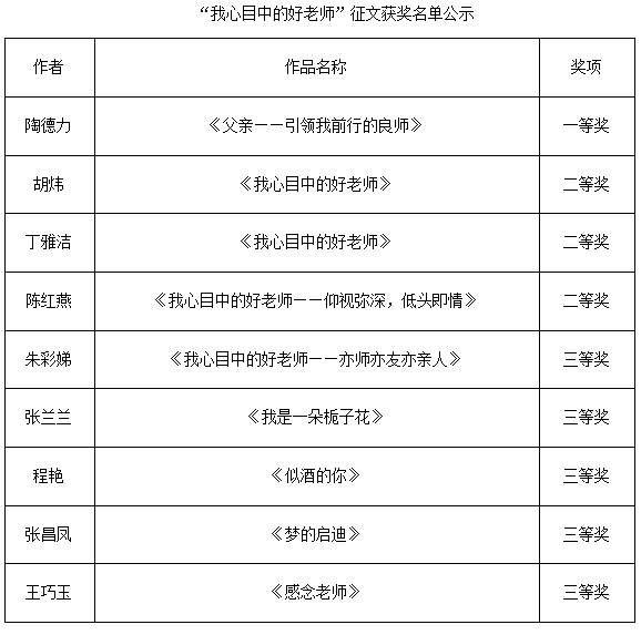 根据《安徽省教育厅关于做好庆祝2015年教师节有关工作的通知》、《安徽省教育厅关于开展“深入贯彻落实习近平总书记教师节重要讲话精神,争做‘四有’好老师”主题教育活动月的通知》以及《万博科技职业学院关于举办“我心目中的好老师”主题征文活动通知》文件的精神,经组委会评审,现将2015年万博科技职业学院举办的“我心目中的好老师”征文大赛结果予以公示,如有异议,请在7日内联系学院宣传部。