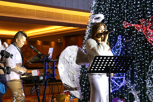 在菲律宾乐队温情的歌声中,圣诞老人背着盛满祝福与好运的红礼包,携美丽的圣诞女郎“驾”着他的“马车”惊喜现身,他们穿梭于来宾的身旁,并带给他们赋予祝福的糖果。