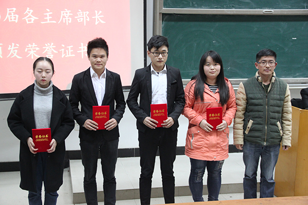 杨冬至老师上台讲话。他对学生会上一年度的工作表示充分的肯定,希望新成员能发扬前辈的优良作风,前赴后继,迎接挑战,积极进取,在以后的工作中做出更大的贡献。为表彰先进,随后由杨冬至老师为上一届优秀学生干部颁发奖状。