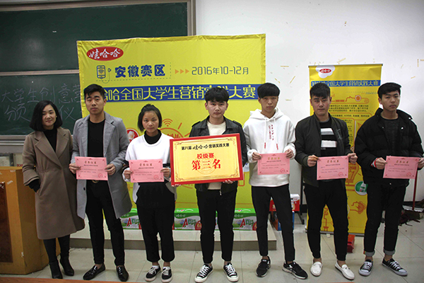 经过一个月的紧张比赛,由院创业指导委员会、院就业办、院团委联合举办的第八届全国大学生哇哈哈营销实践大赛校级赛圆满落下帷幕。12月7日下午,在3202教室隆重举行了第八届全国大学生哇哈哈营销实践大赛校级赛的颁奖典礼。院创业指导委员会副主任、财经分院院长李德明,杭州娃哈哈集团安徽分公司高校市场总监陈晓春先生,学院团委洪丽老师,财经分院辅导员盛婷婷老师应邀参加本次颁奖典礼。