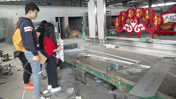10月17日,2014级视觉传达专业师生们又来到位于包河工业园的合肥子午线标牌厂参观学习,在老师和工作人员的介绍下,实地了解了各种型材、铝锌板、亚克力、双色板的规格,观察到毛坯制作、喷漆、烤漆、雕刻的工艺流程;学习到平面发光字、超薄灯箱、点阵字的制作原理。两次市场考察让同学们收获很多理论课堂里没有的新知识,有的同学直呼“开眼界”,有的同学说这下“心里有底气,到实习单位再也不胆怯了”。