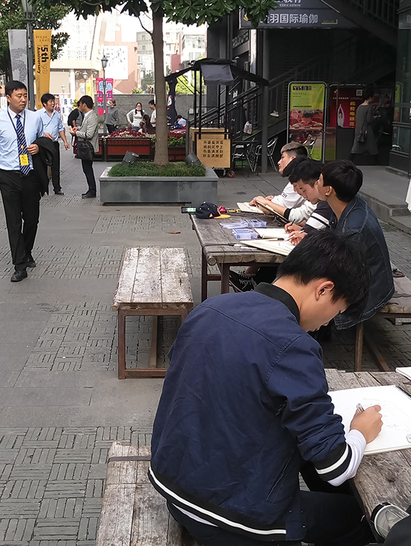 10月17日,2015级室内设计班62位师生乘坐校车,来到有着“城市的名片”美誉的 “1912”进行景观造型速写的写生课,在这个现代和传统风格并存的概念街区里,同学们拿起速写本、占有利角度、寻找透视点,不一会儿马头墙、雕花门栏、小资情调的餐厅就在寥寥数笔中呈现出来。手绘课程需有完整的课程体系,线条、单体、小品的练习,到线稿、色稿的临摹最后写生环节,训练室内专业学生的手绘创作能力,训练学生能提笔就画动手来操作软件的实战能力。