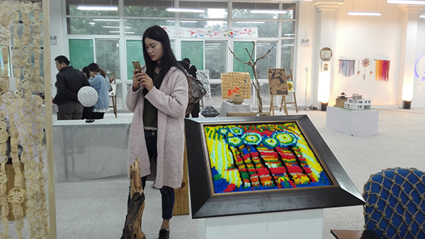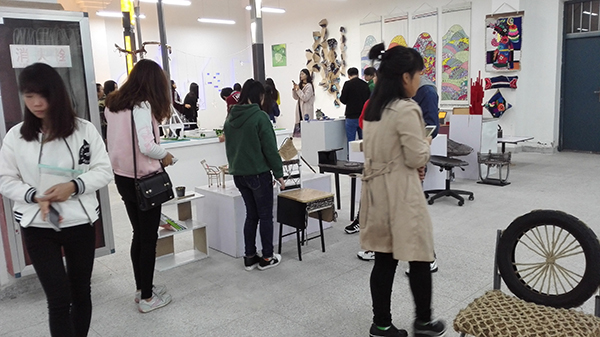 10月27日, 2015级室内设计班和2014级视觉班的师生却兴致盎然参观安徽工商职业学院艺术系,大家在艺术系展厅里欣赏沙发设计的解构与重构设计作品;织绣、染织类装饰设计、雕塑作品。同学们纷纷拍照留资料,看到各种废旧材料焕新的再设计,纷纷赞叹“今天没白来”,“回去做立体构成作业知道怎么办了”。