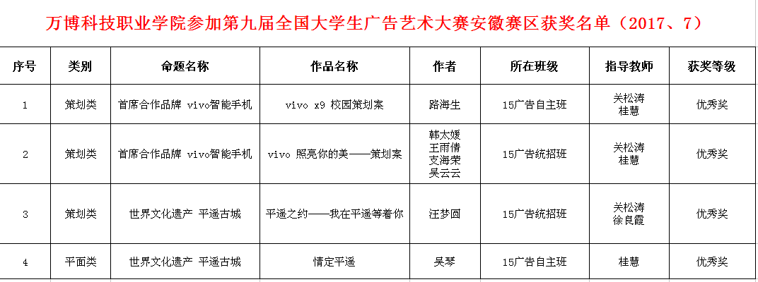 2017年7月21日,从第九届全国大学生广告艺术设计大赛(简称“大广赛”)组委会安徽分赛区传来喜讯,我院的广告设计与制作专业的学生在其教研室主任关松涛、专职教师徐良霞和桂慧等老师的指导下,共获得了4项优秀奖,其中关松涛、桂慧老师指导的15广告自主班的路海生同学、15广告统招班的韩太媛、王雨倩等同学,关松涛、徐良霞老师指导的15广告统招班汪梦圆同学分别所撰写的广告营销策划案均获得大赛的策划类优秀奖;桂慧老师作指导的15广告自主班吴琴同学创作的平面作品(广告语)获得大赛的平面类优秀奖;这是我院师生近10年第一次参与此项比赛,也是零的突破,更是新的起点。