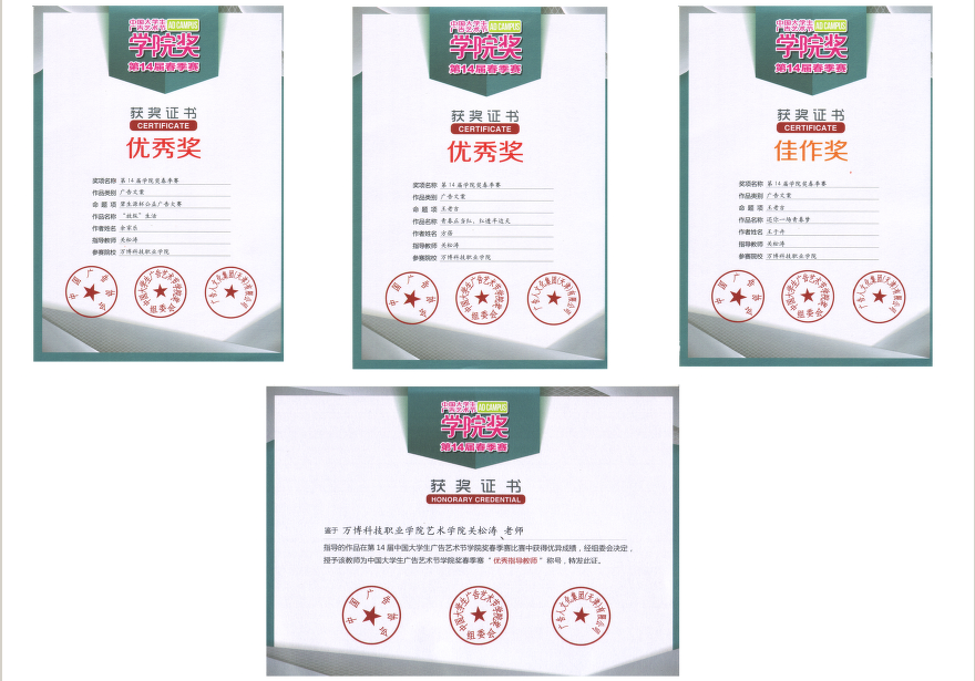 我院广告设计与制作专业的师生从2016年的第14届中国大学生广告艺术节学院奖春季赛开始参赛,截止到目前的第15届中国大学生广告艺术节学院奖春季赛,共参加学院奖3个赛季的赛事,在大赛之中共取得优秀奖5项,佳作奖11项,优秀指导教师5人次,据悉,这样的成绩在全省的高职院校之中成绩也是可喜的。