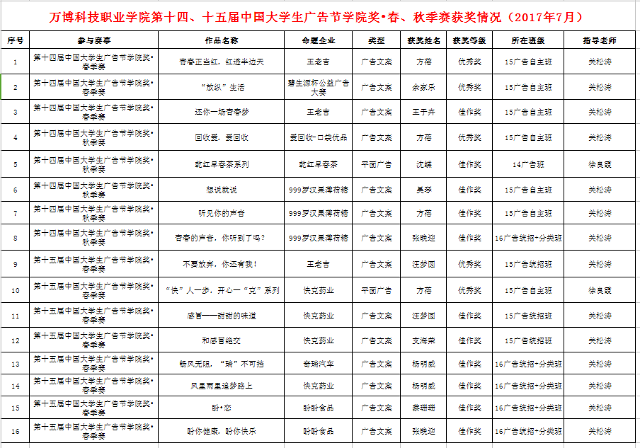 2017年7月19日,由中国广告协会主办,广告人文化集团承办的第15届中国大学生广告艺术节学院奖秋季赛圆满落幕。作为中国大学生创意的年度盛事,第15届中国大学生广告艺术节学院奖春季赛走遍全国26个省、30个城市,40所高校,携手34位大咖讲师,21家命题企业,收获 18.6万件创意作品,创意之风席卷中华大地。经过层层评审,我院师生在此次比赛之中再次实现突破,获得了良好的成绩;取得了2项优秀奖,6项佳作奖。2015级广告统招班的汪梦圆、2015广告自主班的方蓓两位同学分别荣获大赛的优秀奖;2015级广告统招班的汪梦圆、支海荣,2016级广告统招+分类班的杨明威(2项)、蔡珊珊和张晚迎5位同学分别荣获春季赛佳作奖。广告学教研室主任关松涛和专职教师徐良霞再次分别荣获第15届中国大学生广告艺术节学院奖春季赛的优秀指导老师奖。