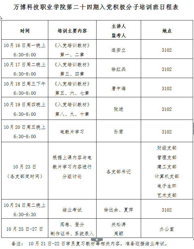 附件:万博科技职业学院第二十四期入党积极分子培训班日程表