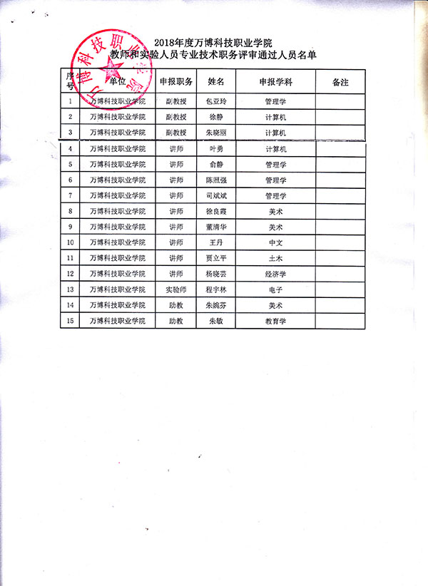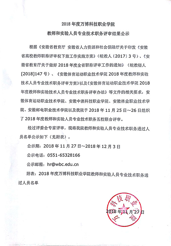 2018年度万博科技职业学院教师和实验人员专业技术职务评审结果公示