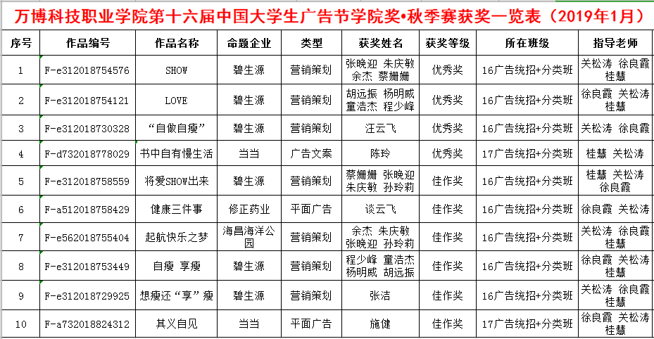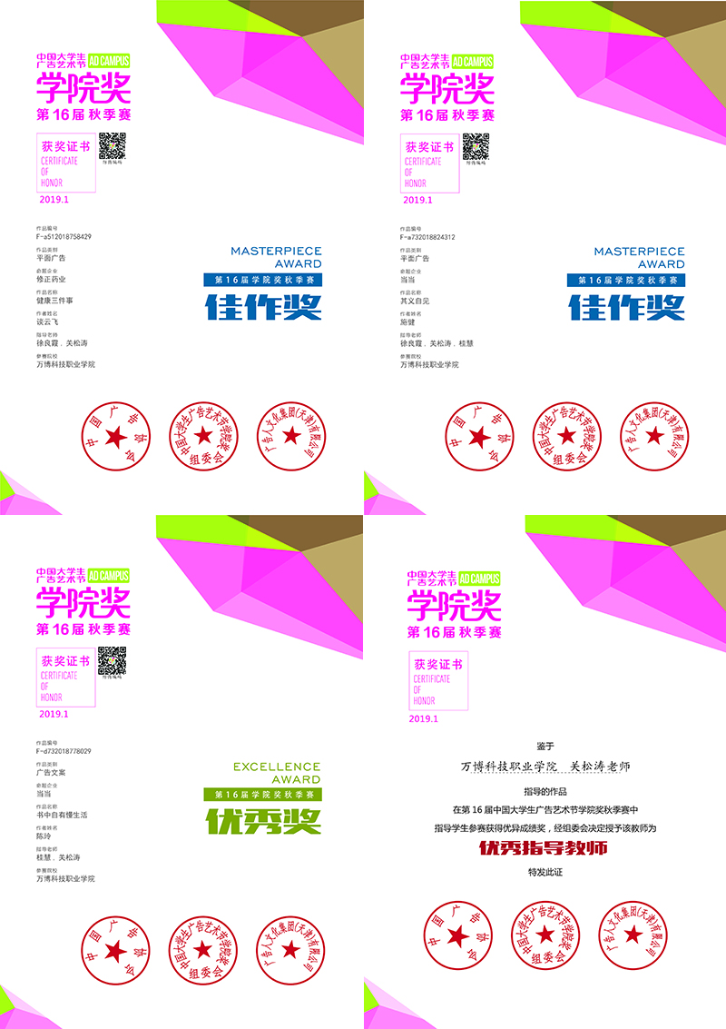 我院师生在此次比赛中再获佳绩,收获优秀奖4项,佳作奖6项,且获奖作品类型较往年实现了突破性,含平面设计、广告文案和营销策划案等类型。2016级广告设计与制作专业的张晚迎等9名同学以及2017级广告设计与制作专业陈玲同学荣获大赛“优秀奖”,2016级广告设计与制作专业蔡姗姗等11名同学和2017级广告设计与制作专业施健荣获大赛“佳作奖”。此外,艺术分院广告学教研室主任关松涛和专职教师徐良霞、桂慧分别荣获学院奖秋季赛的“优秀指导老师奖”。