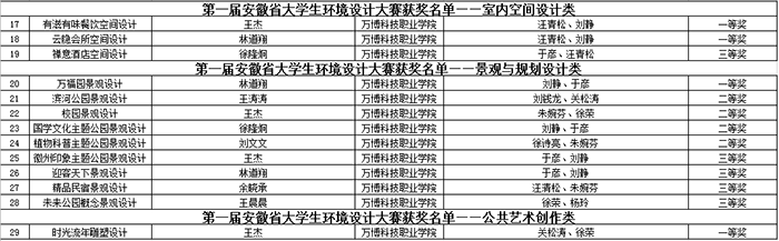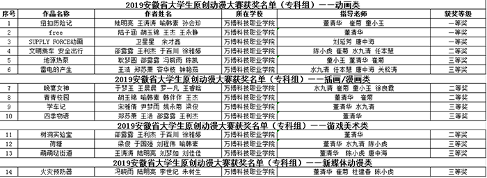 新年伊始,喜报连连。近日,在安徽省教育厅主办,各高校承办的2019年安徽省大学生学科和技能竞赛中,我校学子不负期望,荣获2019年安徽省大学生原创动漫大赛(专科组)一等奖、第一届安徽省大学生环境设计大赛一等奖、2019年全国大学生英语竞赛一等奖等多项佳绩。