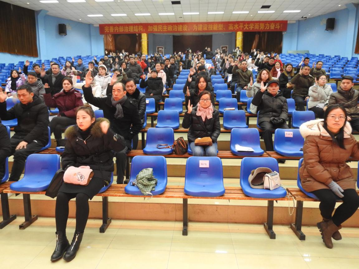 1月16日,我校教职工大会暨第三届一次工会会员大会在学校报告厅隆重召开。会议分别举行了预备会和三次大会,省教育厅督导专员、校党委第一书记王宜,校长孙中义,副校长刘文慧,校党委副书记、副校长刘瑞平,校长助理马赞、耿瑜、张进及全体教职工、工会会员出席了预备会和正式大会。会议审议通过了校长工作报告和《万博科技职业学校教职工大会实施细则》;听取了第二届工会委员会工作报告;选举产生了学校教职工大会执行委员会和第三届工会委员会。