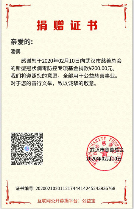 潘勇,我校招生办公室工作人员,中共党员。“一方有难,八方支援。我身为一名普通共产党员,时刻也在关注武汉疫情方面的信息,危难之时,尽我的绵薄之力,希望疫情早日过去,愿武汉早日好起来,加油!”