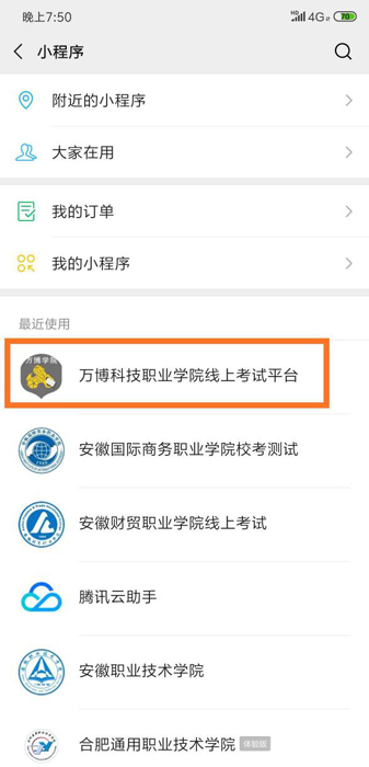 打开手机微信,在“发现”页面中选择小程序查找页面,在搜索框中输入“万博科技职业学院线上考试平台”进行查询,在查询结果中点击“万博科技职业学院线上考试平台”小程序即可打开登录页面;