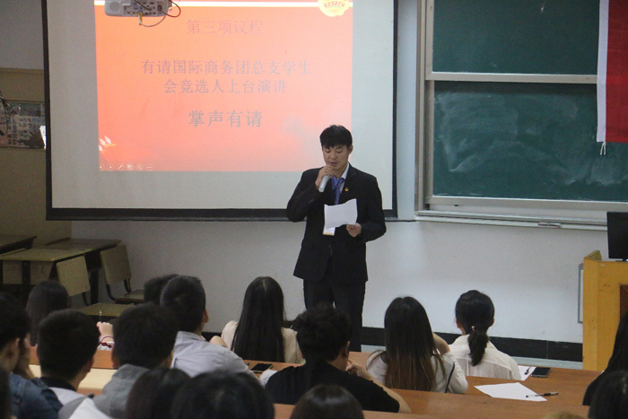 9月23日下午,国际商务学院团总支第二届换届大会在3201教室举行,校团委书记司斌斌书记,校团委周莹老师,国际商务学院党支部书记汪慧书记,国际商务学院学工助理黄吉胜老师、辅导员吕欣欣老师及各分院学生会,大学生记者团,校卫队,社团联合会以及国际商务学院各班级同学参加了此次大会。