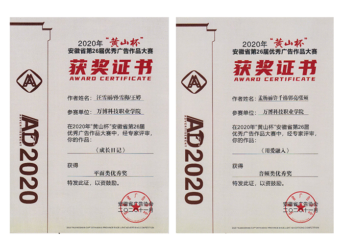 在安徽省广告协会举办的2020年“黄山杯”安徽省第26届优秀广告作品大赛中,我院广告传媒教研室精心组织了18级和19级广告设计与制作专业的全体同学首次参加了比赛,共有两件作品获得此项赛事的优秀奖,分别是徐良霞指导的18广告班汪雪丽、孙雪梅和王婷创作的《成长日记》系列作品,获得大赛平面类优秀奖;关松涛指导的19广告班孟杨丽、许千禧等同学创作的《用爱融入》系列作品,获得大赛音频类优秀奖。