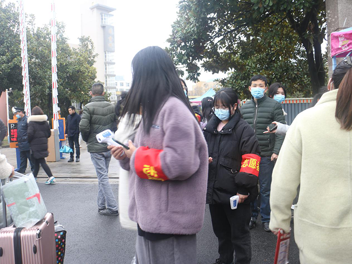 学校报到现场分步骤有序进行。学生统一于学校东门排队报到,现场保持1米以上距离;返校学生提前扫描安康码、出示返校通知单;值班老师及志愿者对来校学生及家长测量体温、行李消毒;学生填写入校表格及入校信息,依次检查过后方可进入校园。