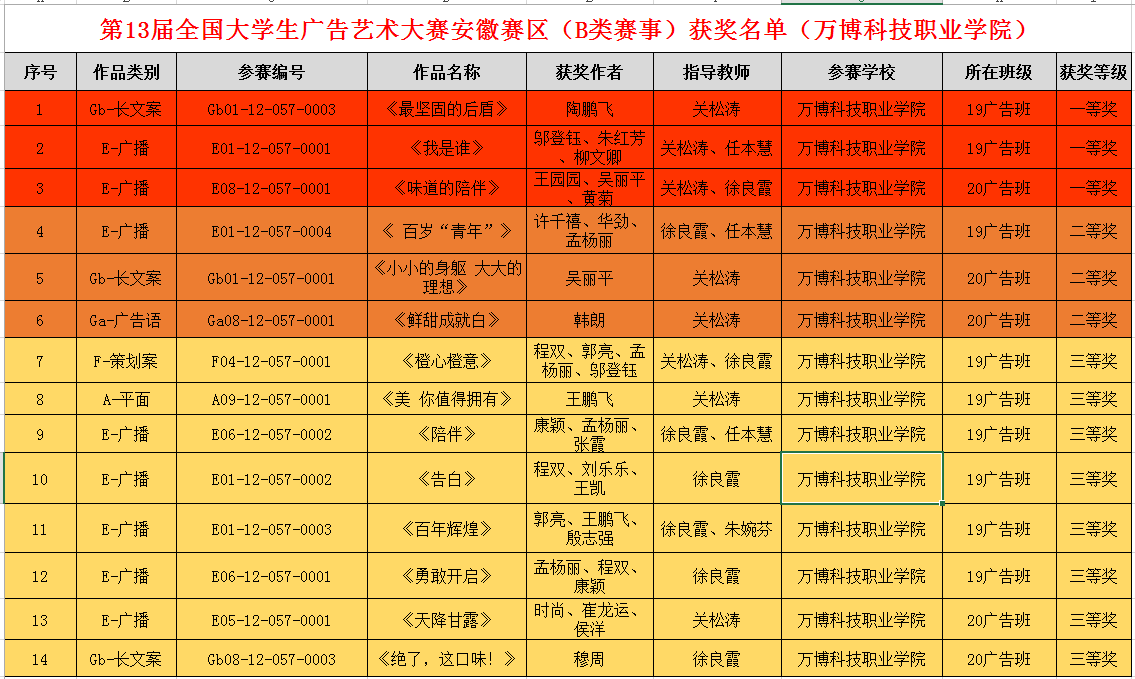 日前,第十三届全国大学生广告艺术大赛(简称大广赛)评选活动在合肥工业大学落下帷幕,并完成获奖作品的公示。我校艺术传媒学院广告传媒教研室师生再创佳绩,共获得本次赛事14个等级奖,其中,一等奖3项、二等奖3项、三等奖8项。本届赛事不仅在获奖比例和数量上实现了突破,还在所参与的五个参赛类别中均获得了等级奖的突破,特别是广播类参赛作品,改写了零的历史,取得了一等奖2项,二等奖1项,三等5项的优秀成绩。