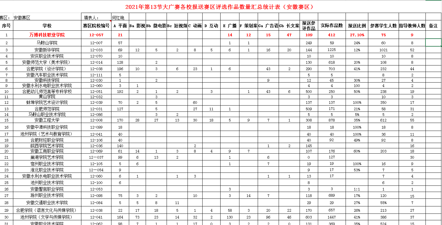 大广赛是迄今为止全国规模最大、覆盖高等院校最广、参与师生人数最多、作品水准最高的全国性高校文科大赛。本届大广赛安徽省赛由安徽省教育厅主办。省内96所院校2万多人参赛,收到参赛作品16227组。评选不区分本科、高职组,通过分组初评、终评、集体合议终评等环节,评选出安徽赛区获奖作品。