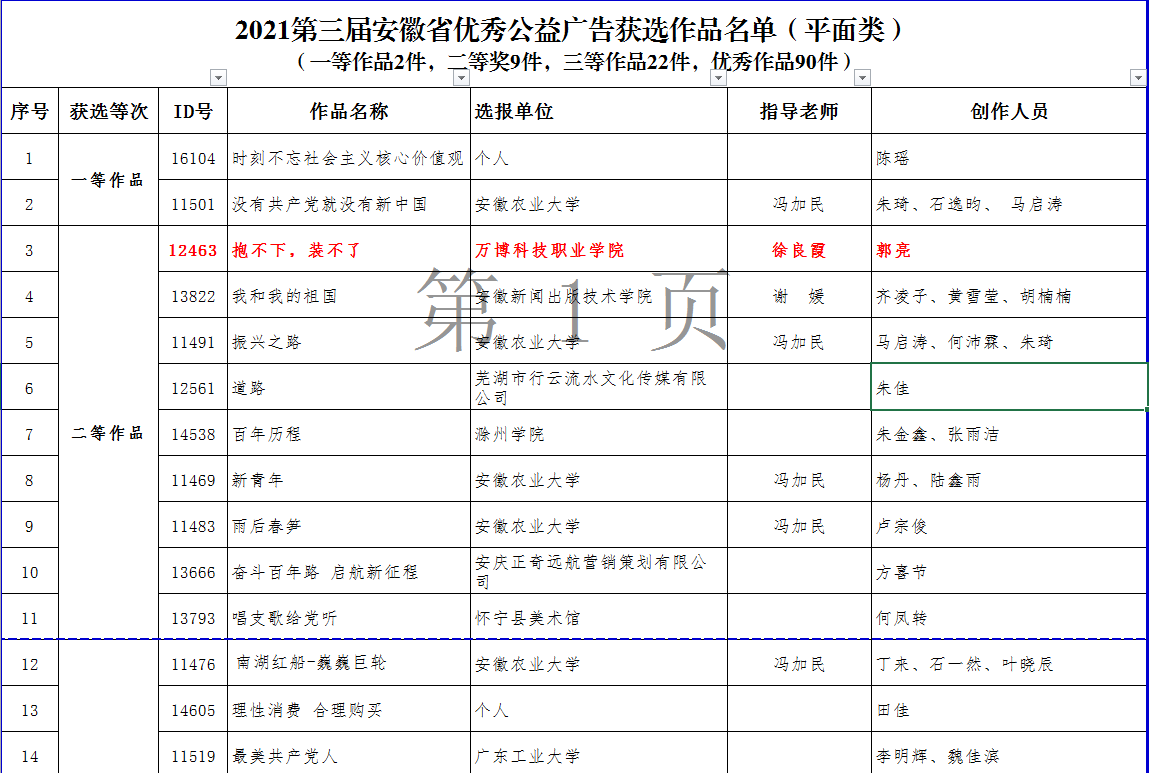 金色九月,硕果飘香。我校艺术传媒学院师生在2021年第十三届全国大学生广告艺术大赛、第三届安徽省优秀公益广告大赛、安徽省第27届优秀商业广告作品大赛和第二十届中国大学生广告艺术节·学院奖(秋季赛)四项学科竞赛中再获佳绩。