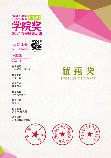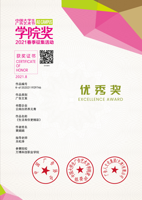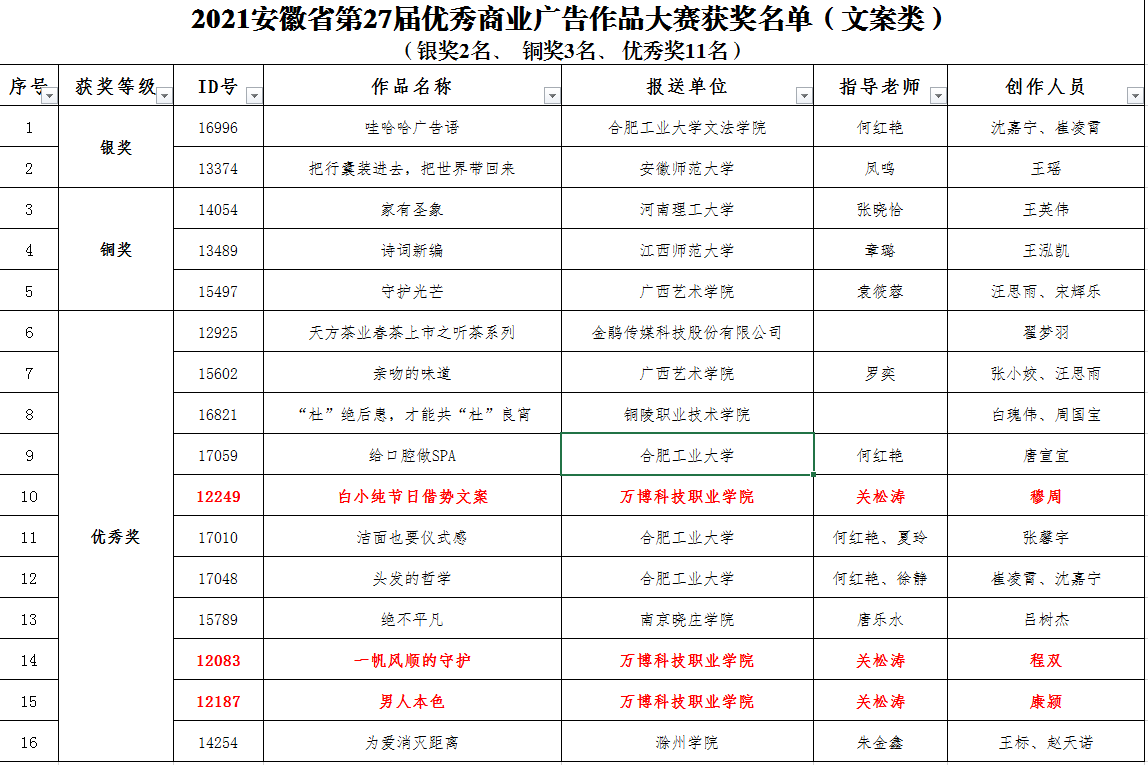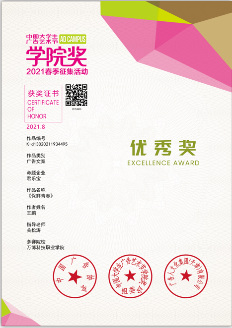 为深入宣传贯彻习近平新时代中国特色社会主义思想,提升安徽商业广告的创意设计水平,激发广告行业活力,促进广告人才培养,进一步树立安徽广告品牌形象,在安徽省市场监督管理局的指导下,安徽省广告协会举办2021年安徽省第27届优秀商业广告作品大赛。我校积极组织2019级广告班和2020级广告班的全体学生进行了实践教学训练和专题创作,在本届赛事平面类、音频类和文案类三个参赛类别中共获优秀奖6项。