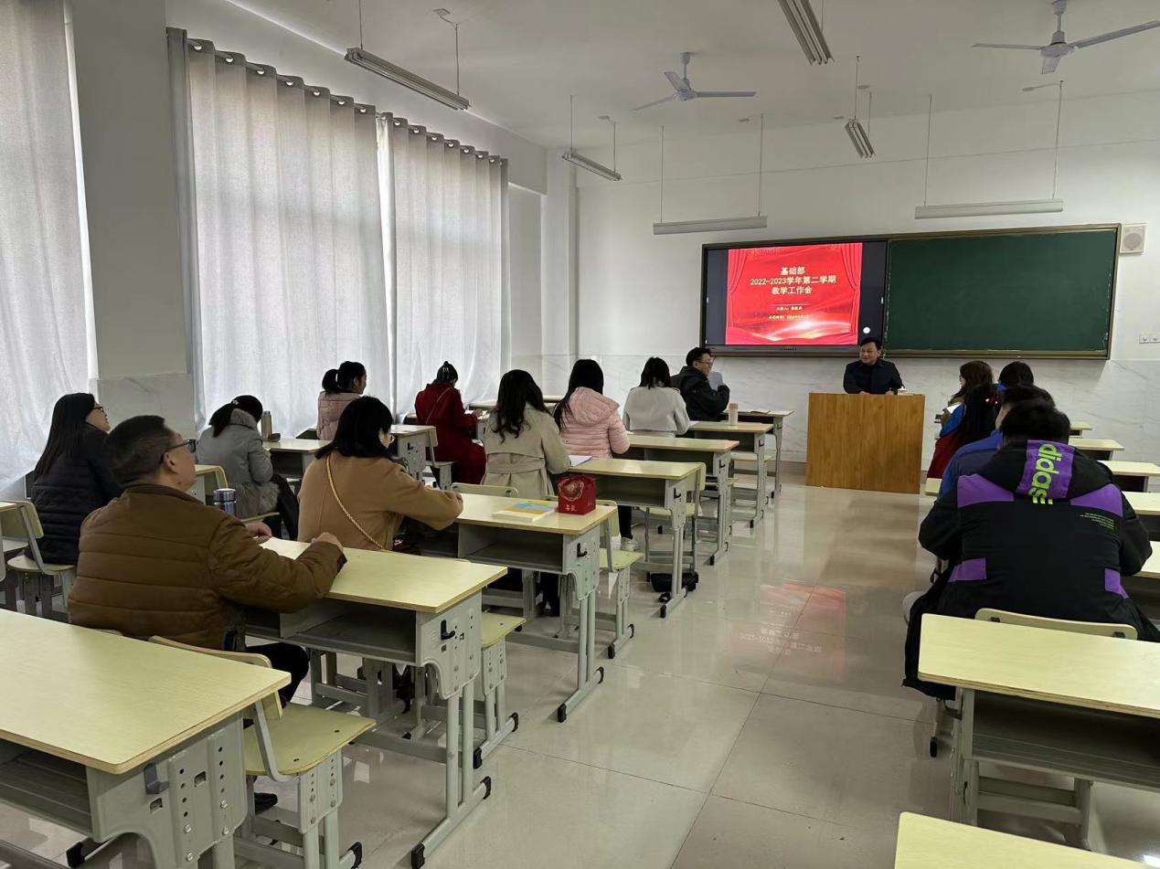 会上,徐红兵传达了教务部的相关会议精神,总结了2022年基础部工作,并根据学院发展现状,结合基础部工作实际,围绕六个方面对本学期部门重点工作作出部署:一是要认真学习贯彻党的二十大精神,提振教师的精气神,以良好的心态投入到新学期的工作中去;二是要加强师德师风建设,学习优秀教师的先进典型事迹,自我查摆工作中的存在的问题,尤其要深刻查找是否有理想信念淡薄、敬业精神不强、工作态度自由散漫、教学方式简单粗暴、违反教学纪律等不良现象;三是要提升教师教学和科研水平,提高青年教师的成长,拓宽青年教师的发展通道;四是要加强教学监控和教学督导的力度,加强教案、课件、进度表、大纲的检查次数,加强互听课的质量,加强上课情况的随机检查力度;五是要加强教研室建设,完善教研活动制度,做到教研活动有计划、有创新、有记录;六是要加强教学改革力度,不断优化教学管理体制,完善教学评价机制;七是要聚焦课程建设、完善公共课程建设标准、职业技能大赛课程辅导等工作。