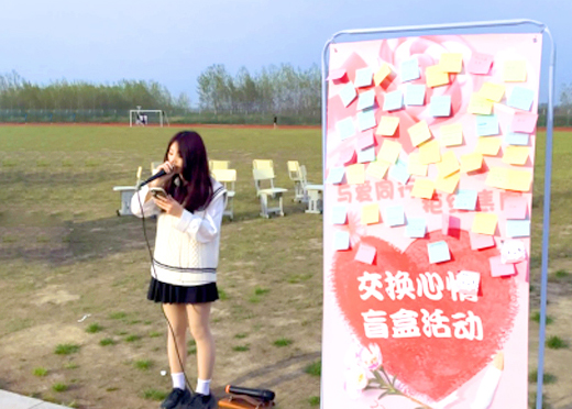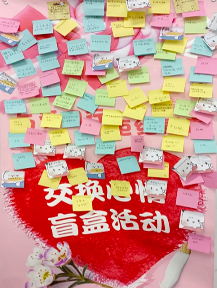 活动从交换心情、才艺展现、互动游戏三个环节展开。同学们将烦恼粘贴在展板上,并从“鼓励盲盒”中抽取一张属于自己的鼓励话语,交换自已的心情,以此缓解心中的压力,甩掉烦恼的包袱,把烦恼化为飞翔的动力,调整自己的心态。