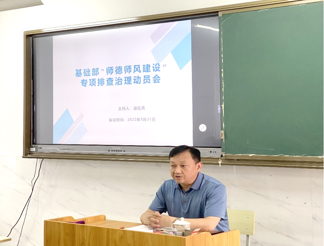 为深入贯彻落实进一步加强新时代教师队伍建设,进一步规范教师从教行为,努力建设一支“有理想信念、有道德情操、有扎实学识、有仁爱之心”的教师队伍,按照学校师德师风建设工作领导小组要求,基础部于5月31日下午在1505教室召开师德师风建设专项排查治理工作动员会。基础部全体教职人员参加会议,会议由基础部负责人徐红兵主持。