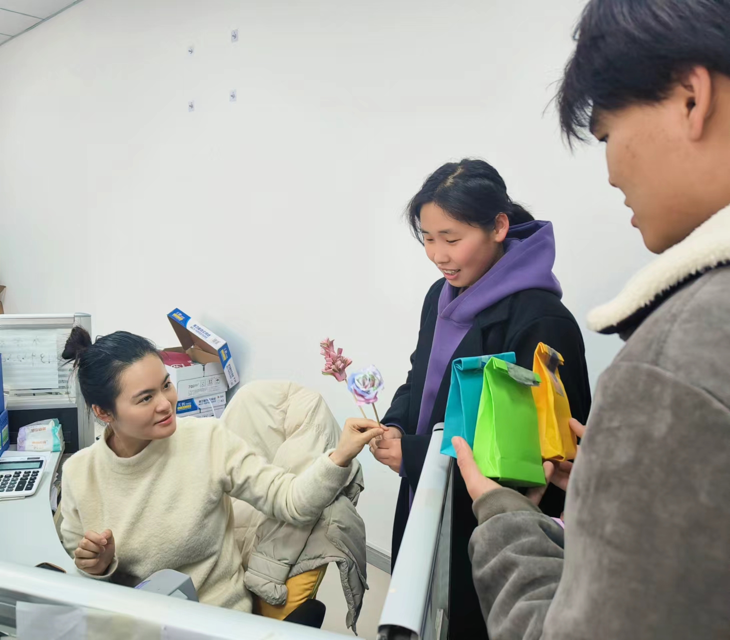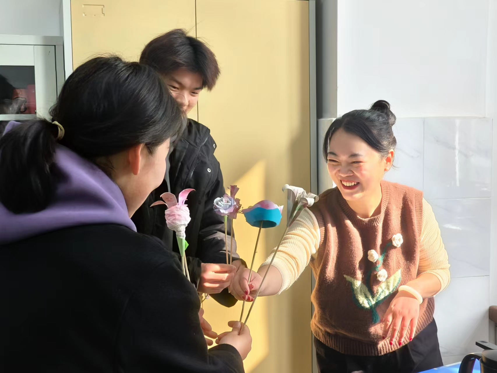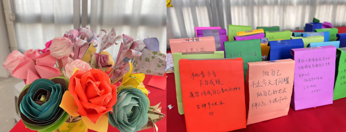活动中,同学们精心设计了美丽别致的手工艺品。他们用餐巾纸做成的纸巾玫瑰和折纸百合含苞待放,用卡纸制成的精美礼袋,里面装着充满惊喜的“糖果盲盒”。礼物虽轻,胜在心意。办公室、宿管休息室、讲台上……学生们把一枝枝美丽的花朵和一个个充满祝福的礼袋送到女老师们手中,感谢她们为学校的发展贡献了智慧和力量,她们无不惊喜又感动,幸福的暖流弥漫在整个校园。