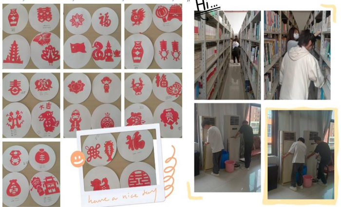 李敏老师带领22财管2班在图书馆开展剪纸活动,同学们认真细致,按照图样剪出了栩栩如生的图样和字体,这次活动既培养了学生不惧繁琐、耐心细致的劳动精神,又让学生深刻体会到中华传统文化的博大精深。在剪纸活动结束后,同学们来到流通书库,擦拭了书架上的浮尘,清洗了空调过滤网和外壳,不畏脏累,出色地完成了劳动实践教育。
