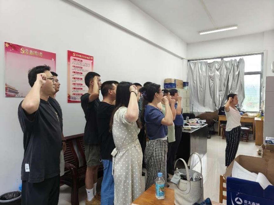 评选结束后,支部全体党员在组织委员兼纪检委员杨庆峰同志的带领下,开展了“重温入党誓词”主题党日活动。面对鲜红的党旗,每一位党员都庄重地举起右手,重温入党誓词,誓言将不忘初心、牢记使命,为共产主义事业奋斗终生。