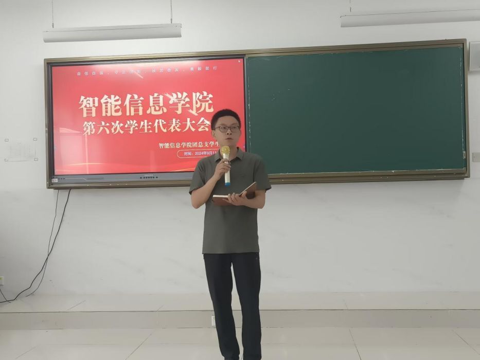 9月11日下午,智能信息学院学生会第六届学生代表大会在教学楼1201教室顺利召开。智能信息学院副院长陈照强、学院党支部书记盛婷婷、校团委周莹老师、学院团总支书记王巧玉、、各班级辅导员老师以及学生联合会、各分院学生会代表出席此次大会。