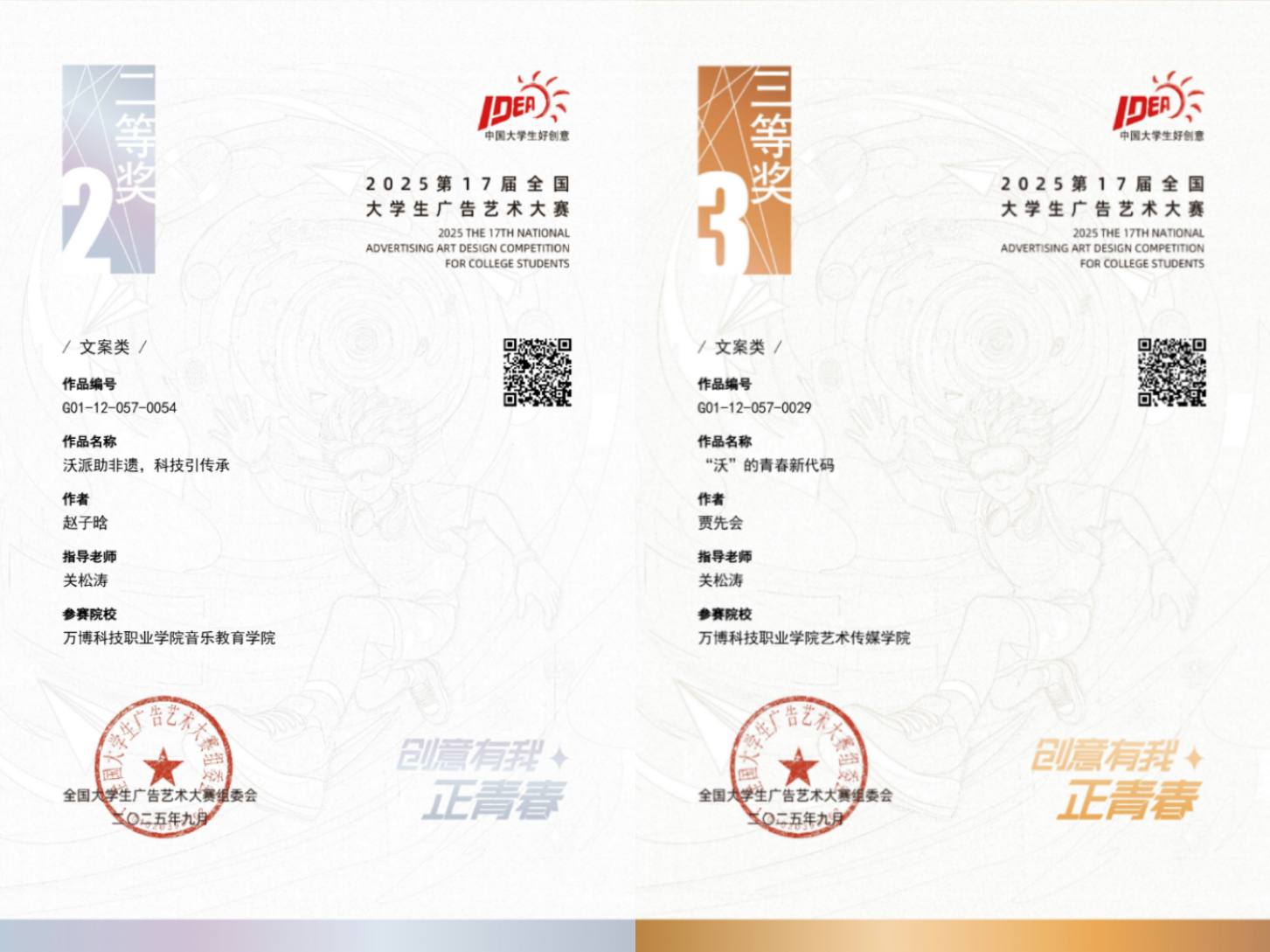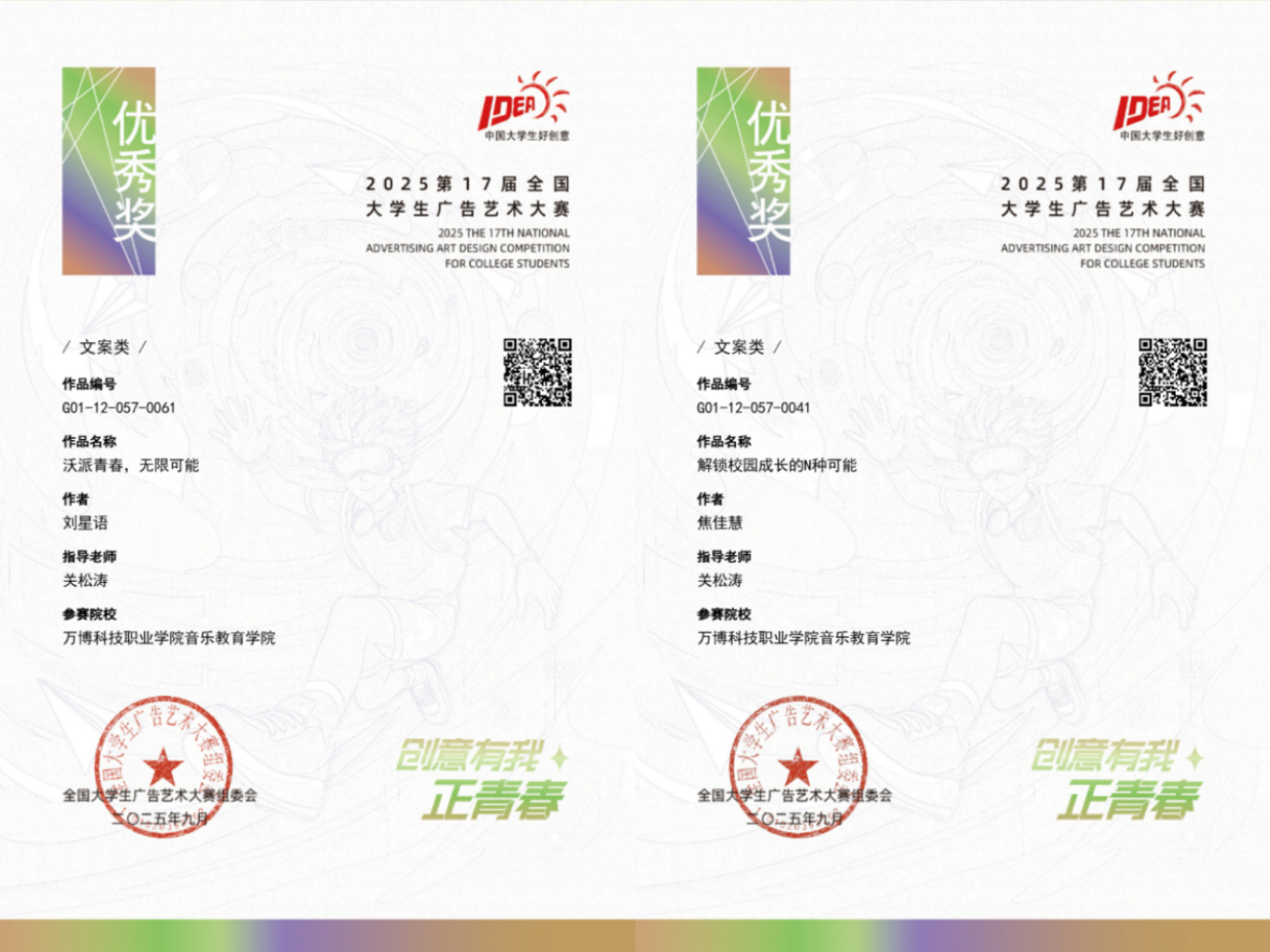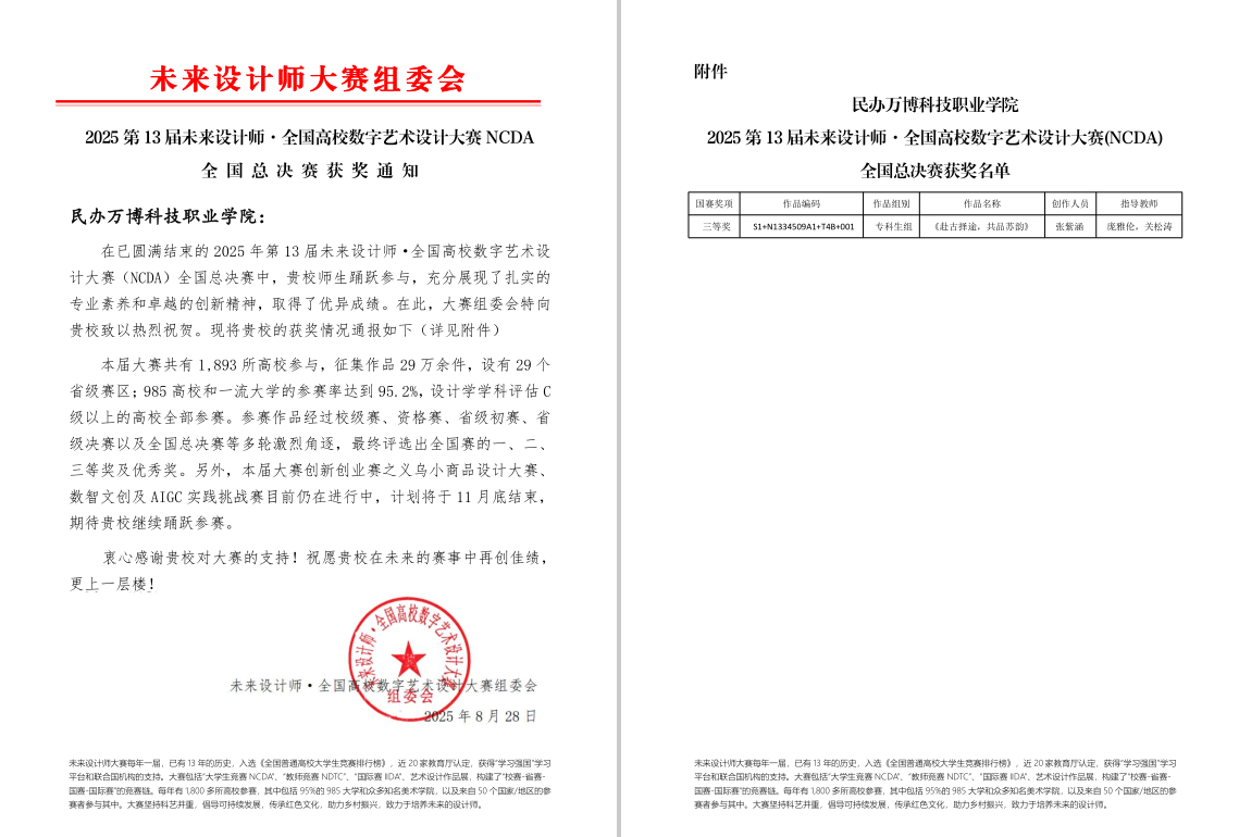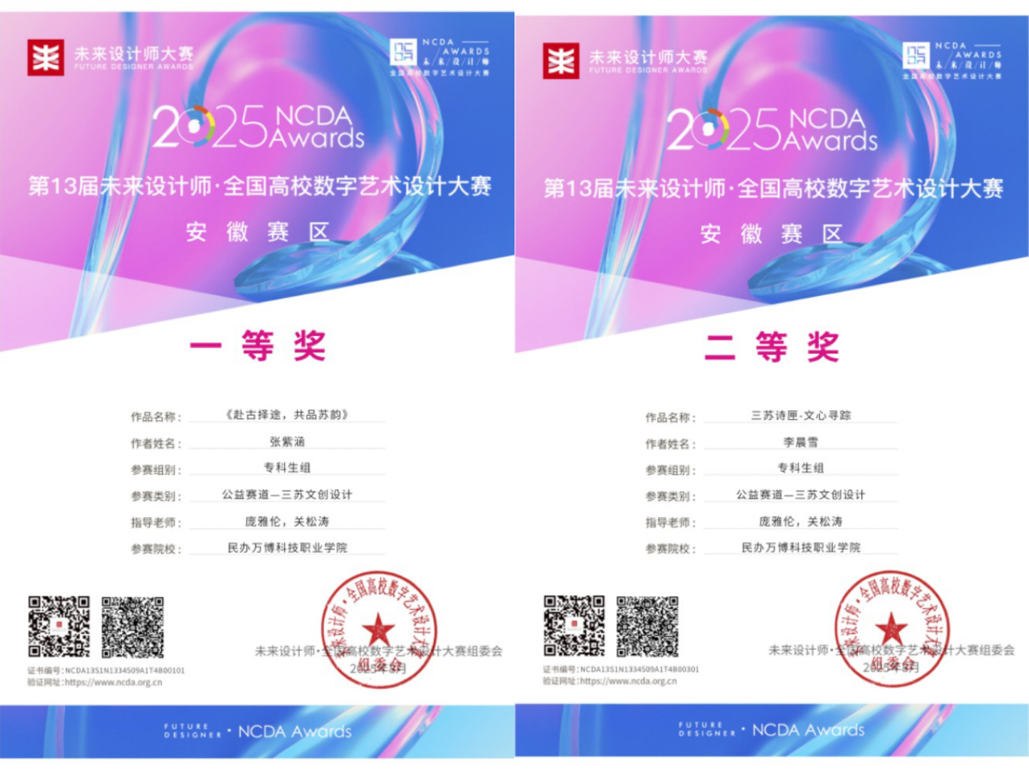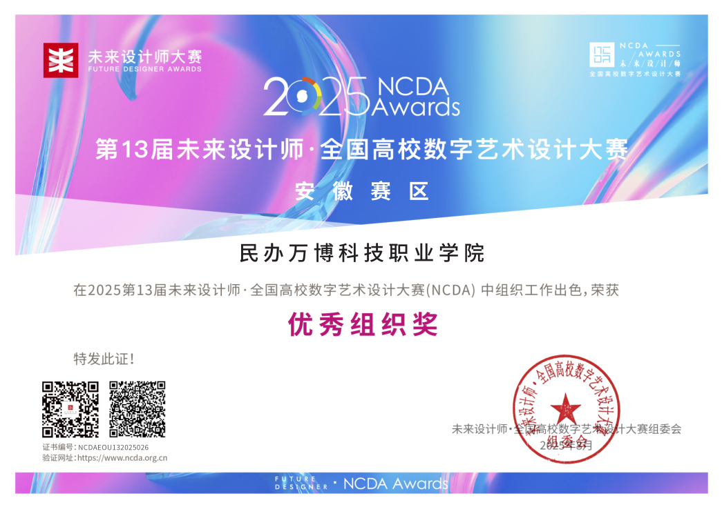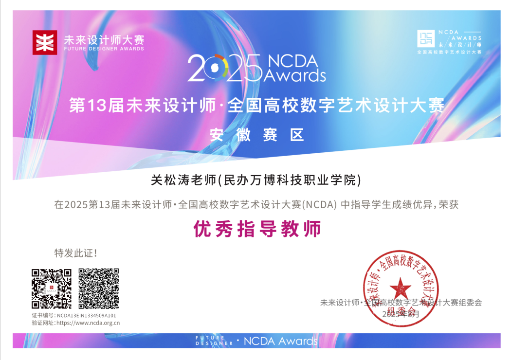 此外,日前,在2025年第十三届未来设计师·全国高校数字艺术设计大赛(NCDA)中,我校师生同样表现突出,荣获全国总决赛三等奖1项;在安徽赛区比赛中,获一等奖1项、二等奖1项、三等奖3项;2位教师获评“优秀指导教师”,1位教师获评“优秀组织教师”,学校获省级“优秀组织单位”称号。