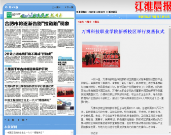 江淮晨报/合肥晚报:万博科技职业学院新桥校区举行奠基仪式江淮晨报/合肥晚报11月30日第A08版发布题为《万博科技职业学院新桥校区举行奠基仪式》,电子版报纸地址为: http://epaper.hf365.com/jhcb/html/